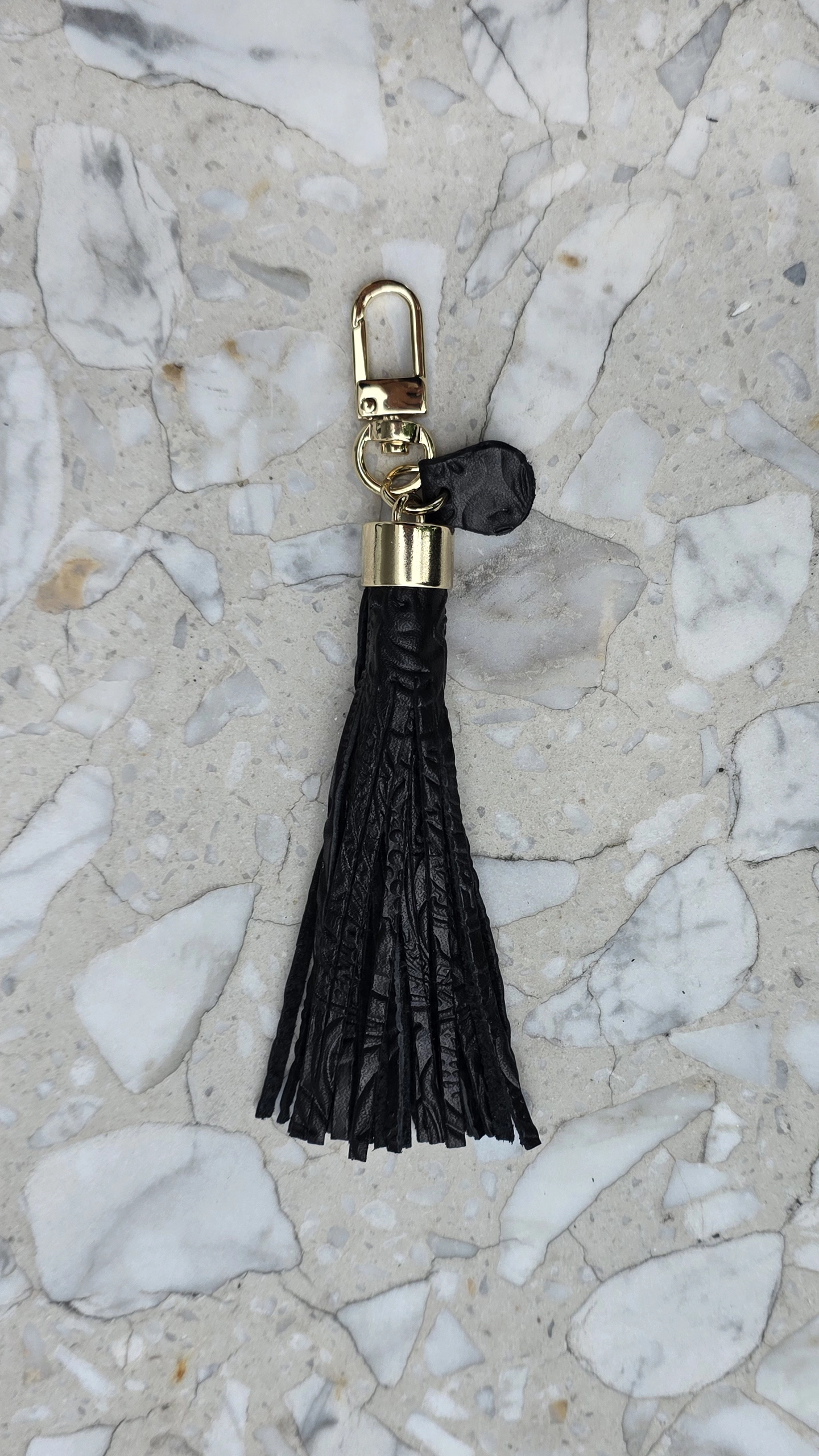 Skórzany frędzel, ręcznie wykonany brelok z włoskiej skóry naturalnej. Skóra bydlęca z widoczną strukturą róż.