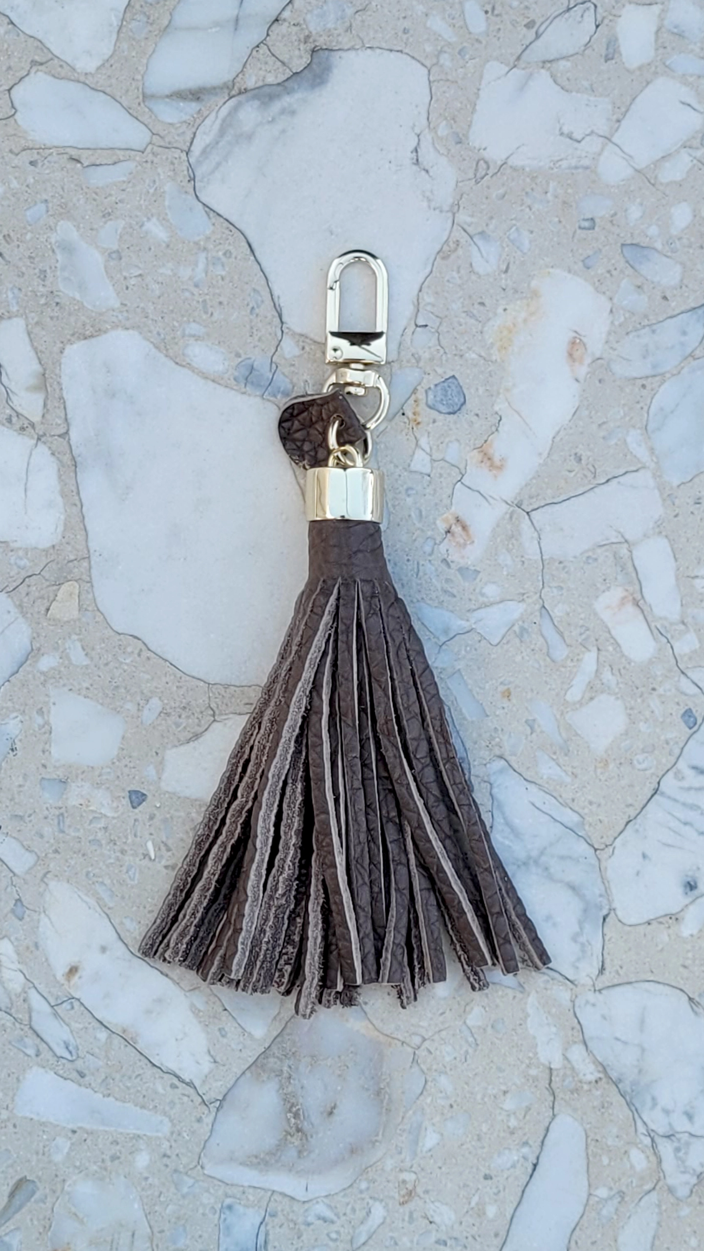 Brązowy frędzel, ręcznie wykonany brelok z włoskiej skóry naturalnej. Skóra bydlęca z widoczną strukturą groszku.