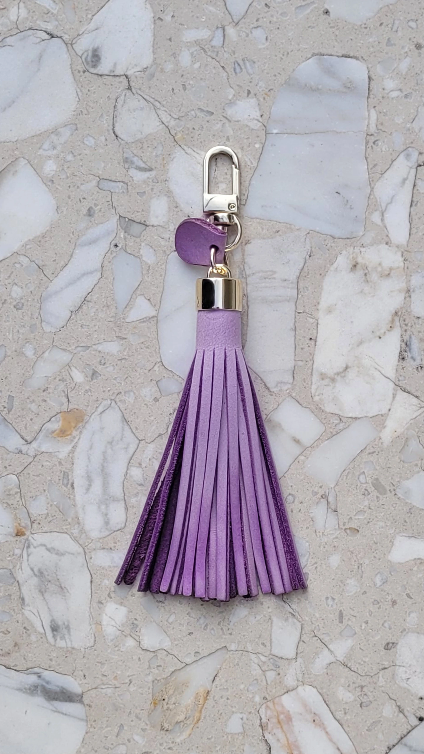 Fioletowy frędzel, ręcznie wykonany brelok z włoskiej skóry naturalnej. Skóra bydlęca gładka.