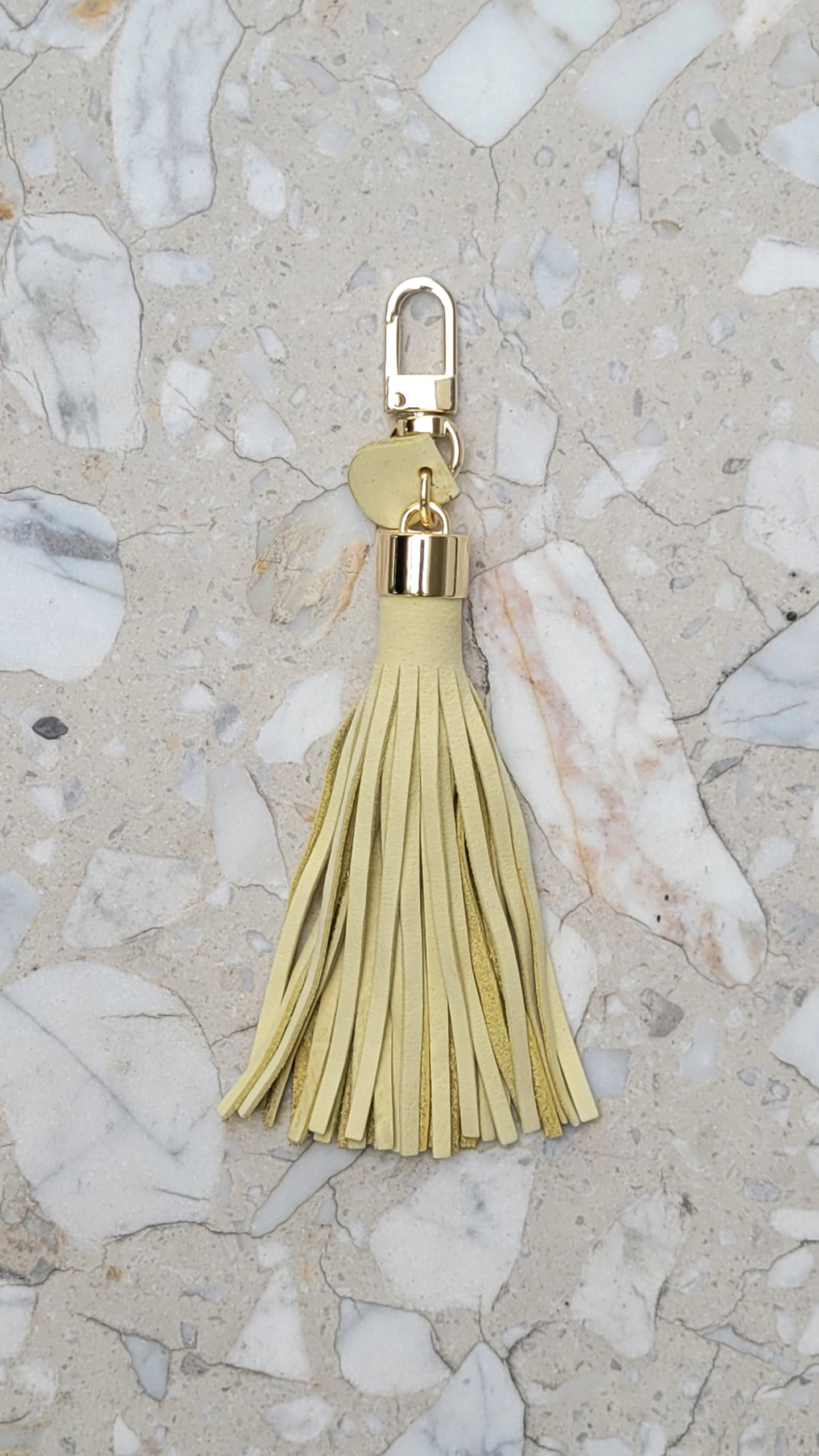 Żółty frędzel, ręcznie wykonany brelok z włoskiej skóry naturalnej. Skóra bydlęca, nubuk.