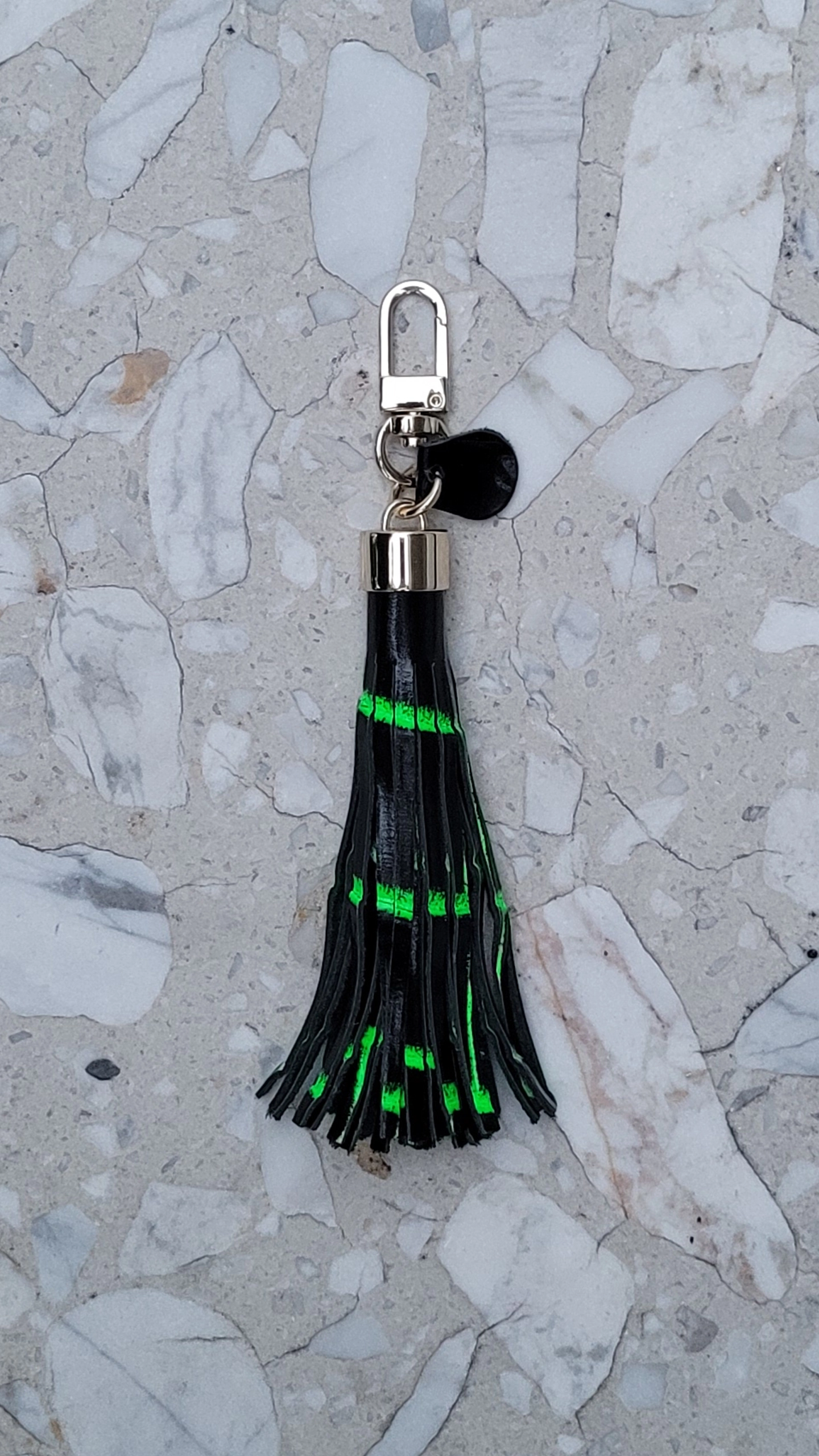 2 Frędzle skórzane do torebki SIMPLE Neon Black Cro – ręcznie wykonany frędzel skórzany możesz dopiąć do każdej bazy modułowej Make Yourself. Skórzany brelok zawiesisz również przy kluczach lub portfelu. Frędzle do naszych torebek nie są mocowane na stałe, wygodny jasnozłoty karabińczyk pozwala je dopinać i odpinać według potrzeby. Torba na co dzień z dekoracyjnym detalem, czy skórzana listonoszka w stylu boho? To Ty decydujesz jaki model nosisz w danym dniu. Krótki breloczek z frędzlami możesz dobrać kolorystycznie do posiadanej bazy i wymiennych pasków lub postawić na kontrast.