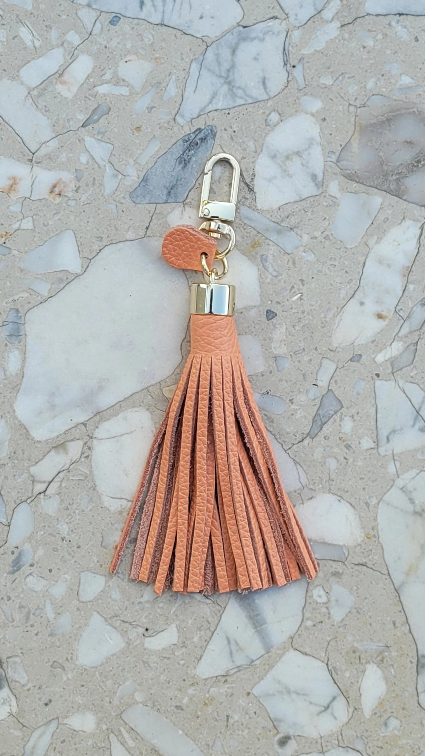 Brzoskwiniowy frędzel, ręcznie wykonany brelok z włoskiej skóry naturalnej. Skóra bydlęca z widoczną strukturą groszku.