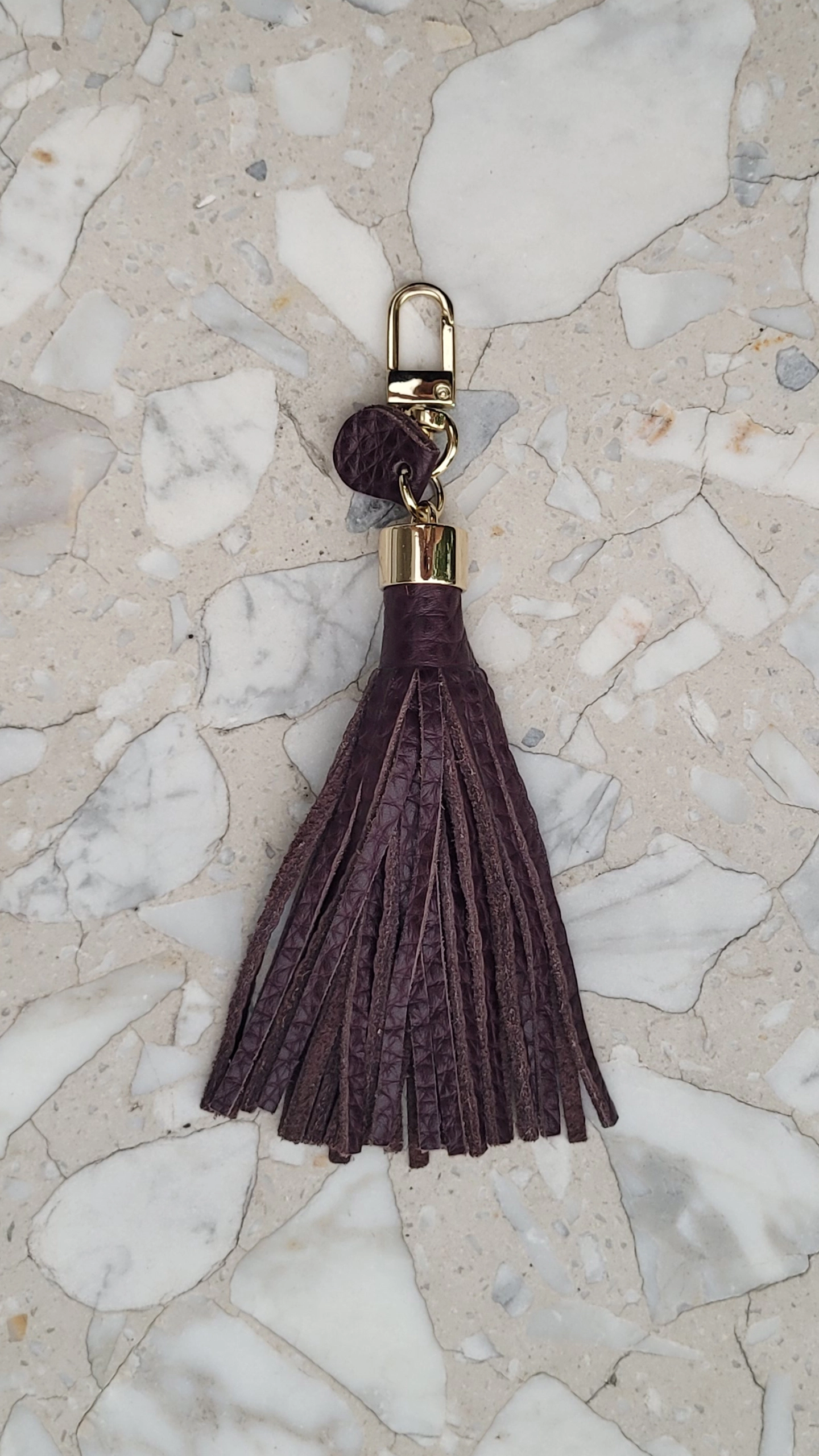 Bordowy frędzel, ręcznie wykonany brelok z włoskiej skóry naturalnej. Skóra bydlęca z widoczną strukturą groszku.