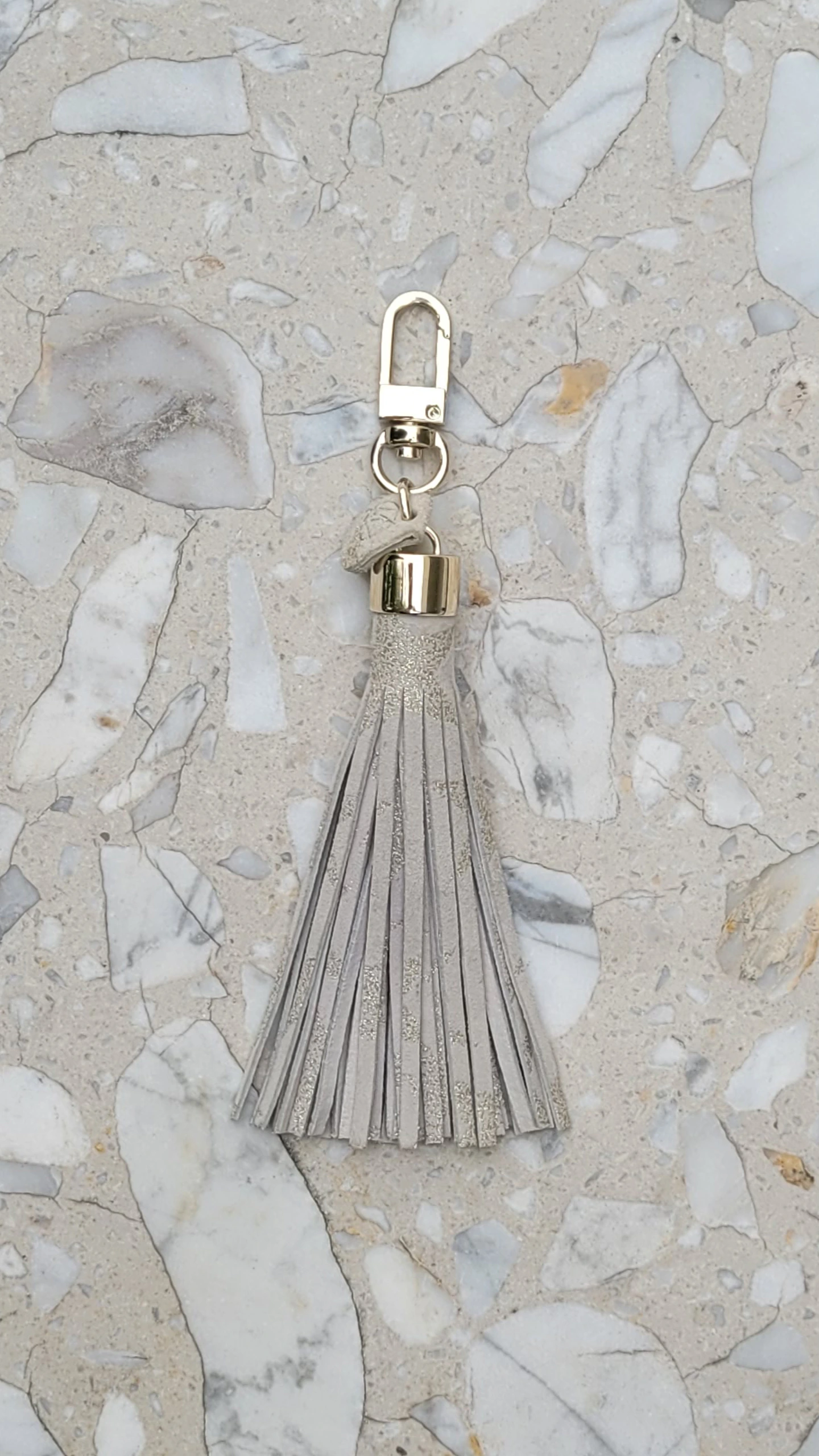 Szary frędzel, ręcznie wykonany brelok z włoskiej skóry naturalnej. Skóra bydlęca zamszowa.