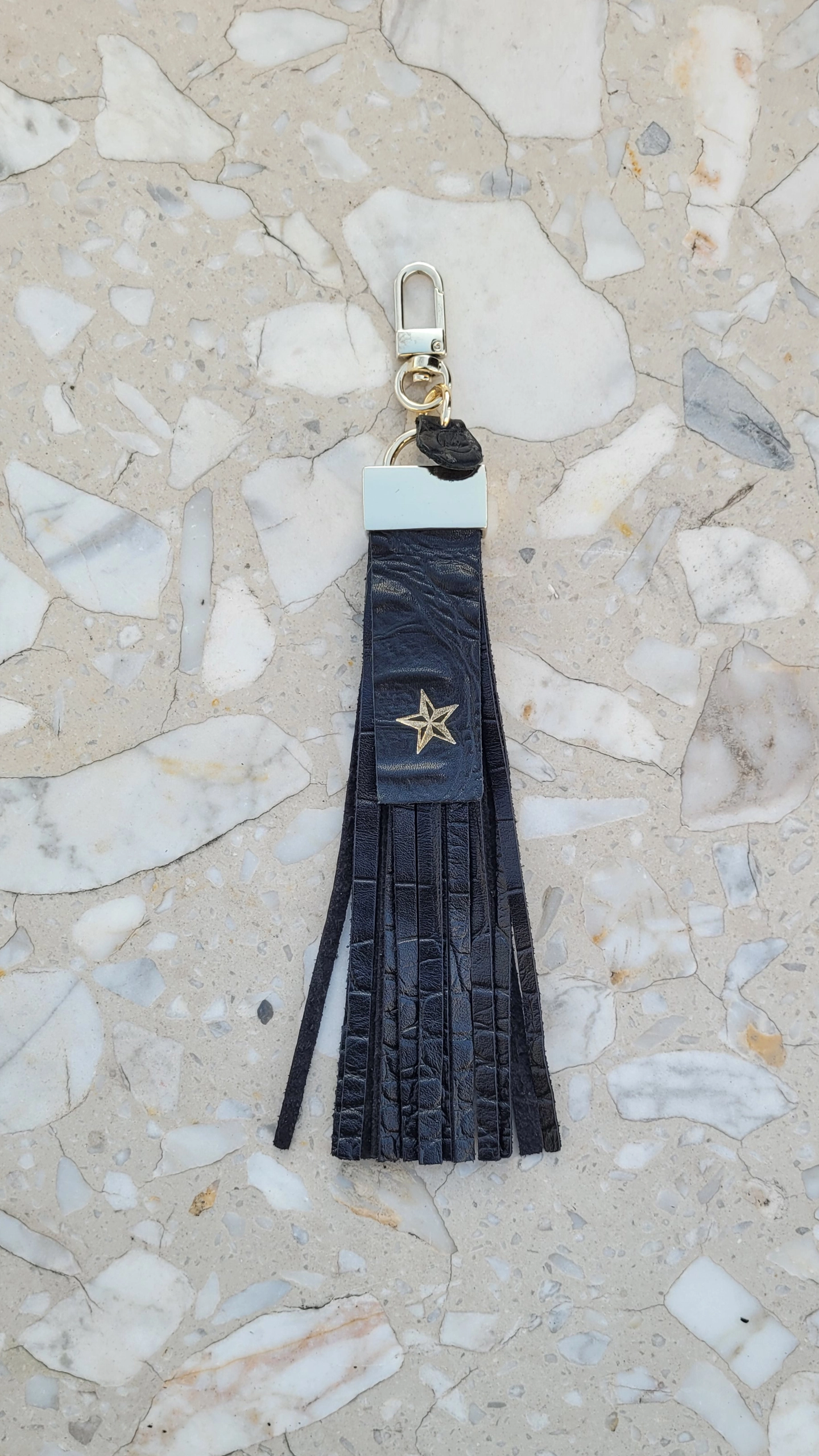 2 Frędzle skórzane do torebki STARS black cro – komplet długich frędzli, każdy brelok skórzany do torebki lub kluczy wykonujemy ręcznie. Stylowy chwost stanowi luksusowy dodatek do każdej torebki ze skóry naturalnej. Dzięki mocnemu karabińczykowi frędzel można zawiesić przy kluczach, portfelu. Frędzle posiadają złocenie Stars.
