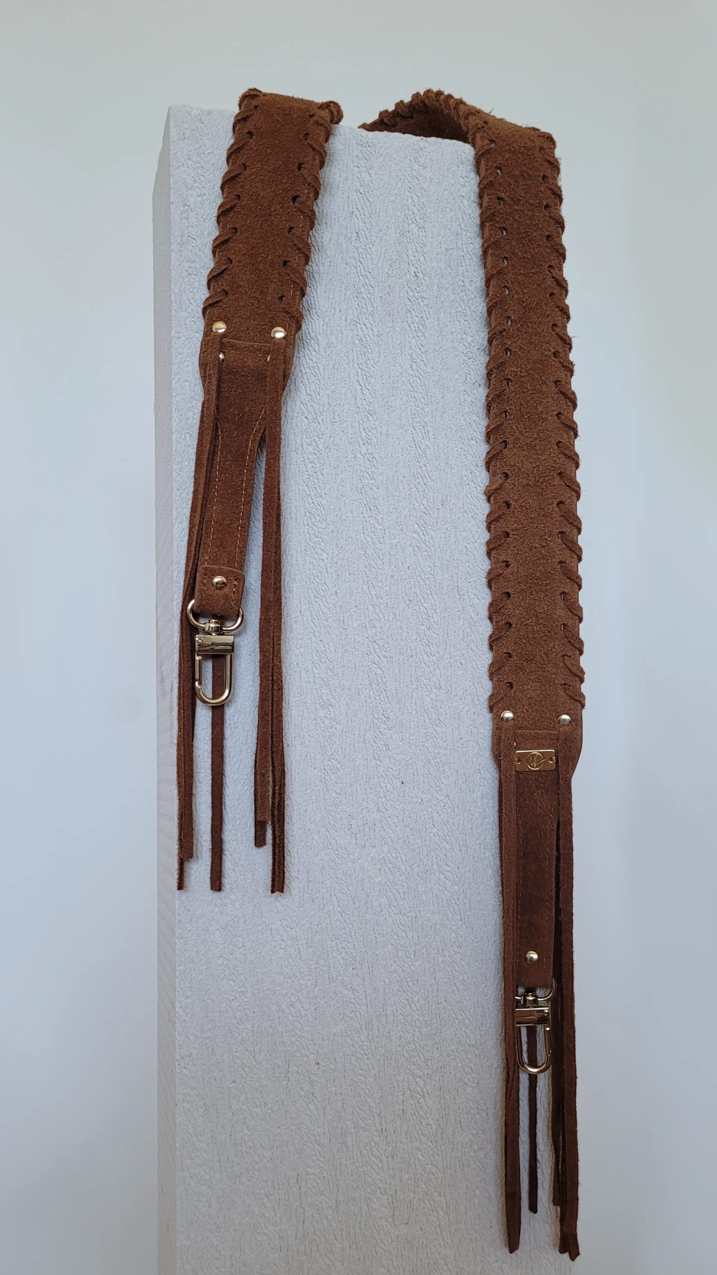 Długi pleciony pasek zamszowy FRINGES Slim cinnamon Make Yourself. Pasek do modułowej bazy dopniesz za pomocą metalowych, jasnozłotych karabińczyków. Standardowa długość paska nadaje się do wygodnego noszenia damskiej torebki na ramieniu, możesz również przełożyć pasek przez ramię. Decydując się na odpowiednią długość, należy oczywiście wziąć pod uwagę osobiste preferencje oraz budowę sylwetki.