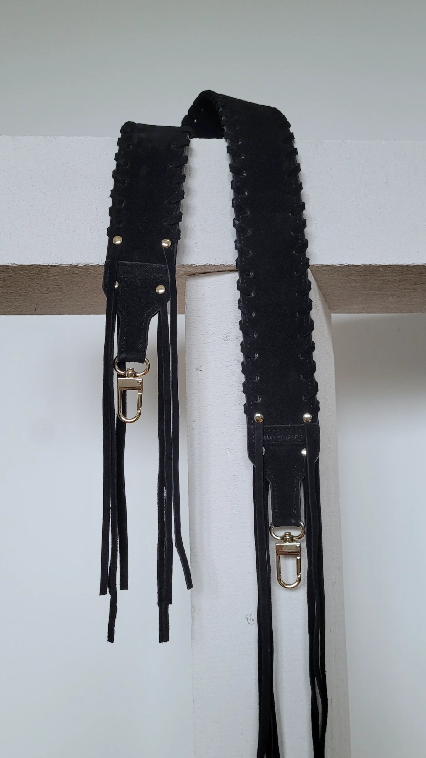 Ręcznie wykonany zamszowy długi czarny pasek do torebki z ozdobnym pleceniem. Skóra bydlęca zamszowa.