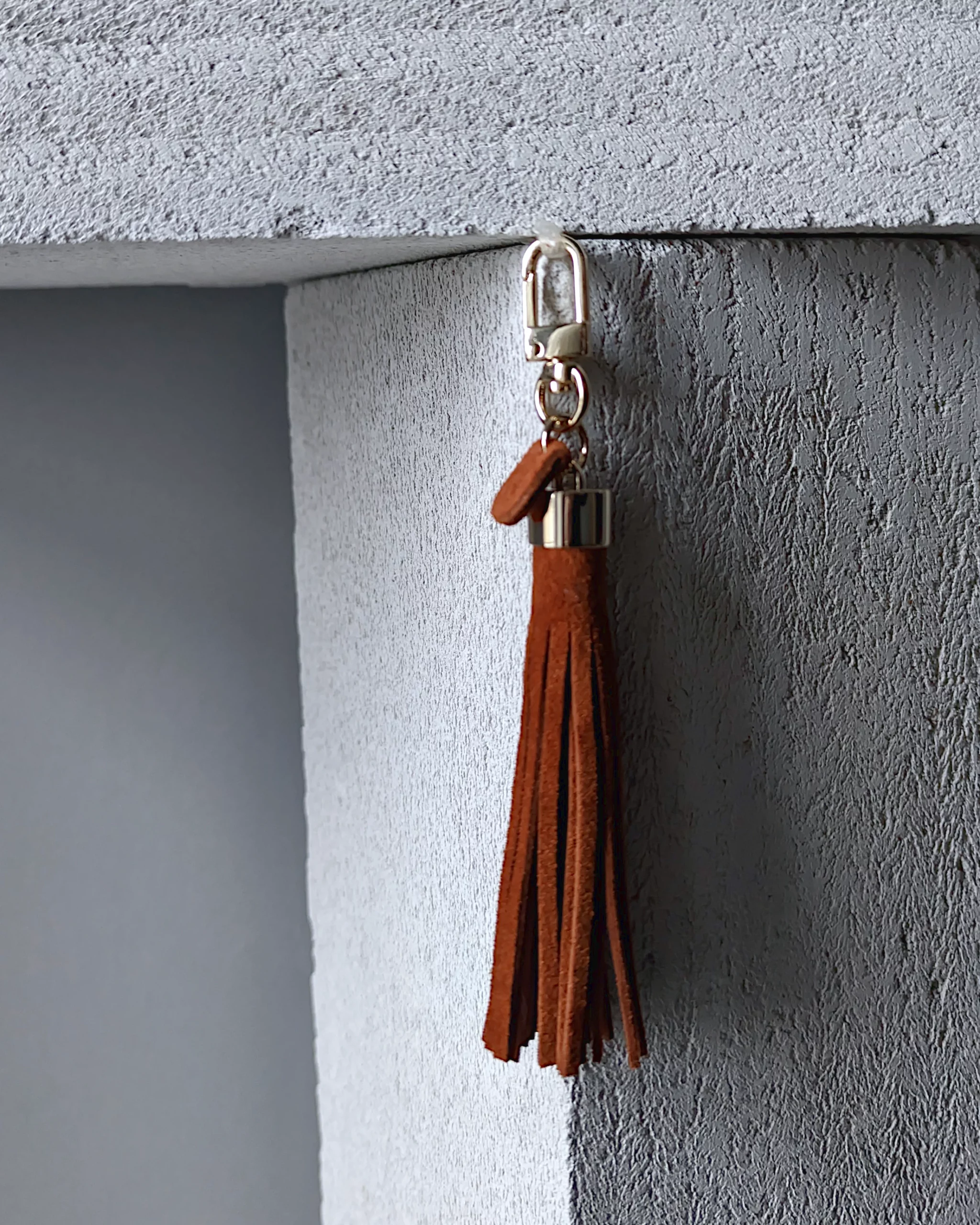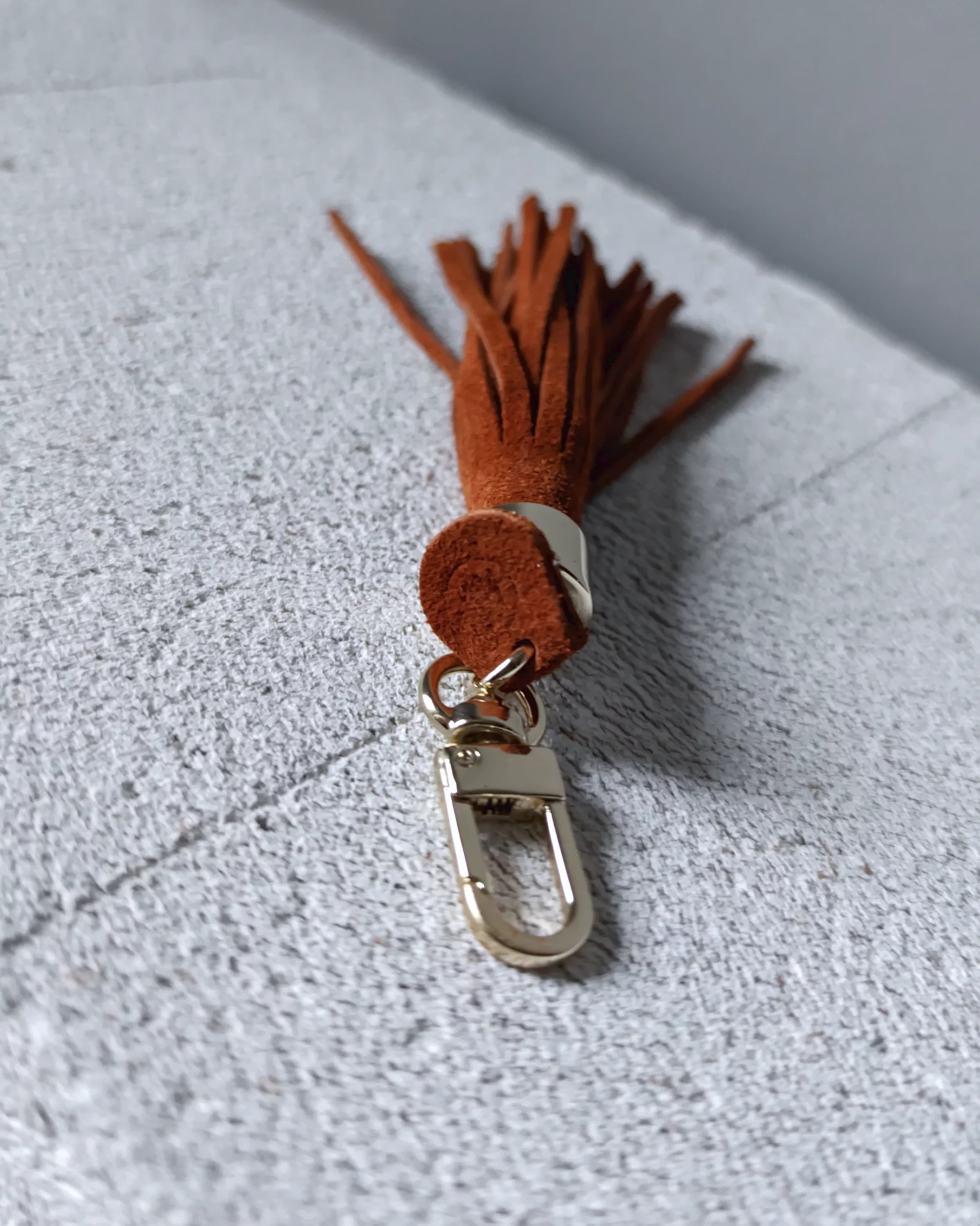 Frędzel zamszowy do torebki SIMPLE amber to krótki chwost do torebki modułowej marki Make Yourself. Skórzany breloczek zawiesisz również przy kluczach lub portfelu.