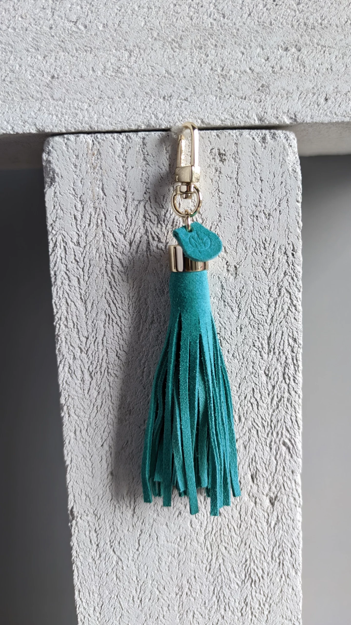 Ręcznie wykonany krótki turkusowy zamszowy frędzel do torebki z włoskiej skóry naturalnej. Skóra bydlęca zamszowa.