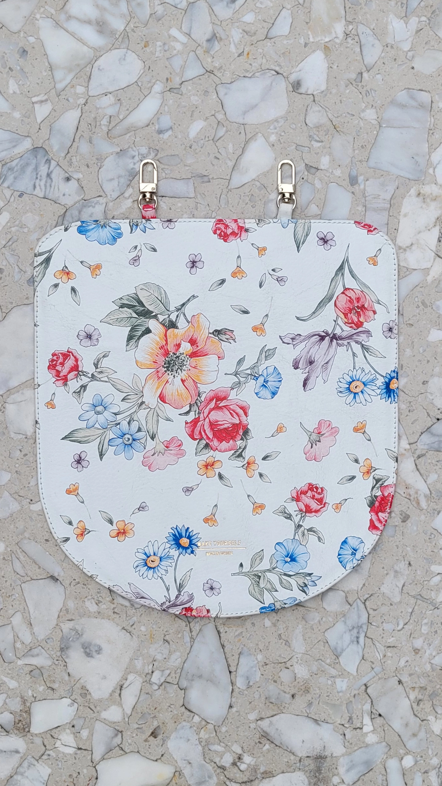 KLAPA FULL MOON Floral do torebek modułowych Make Yourself. Torebkę z klapą stworzysz z modeli bazowych LUNA, CUBE dzięki wszytym karabińczykom. Nie jest potrzebny żaden dodatkowy element czy złączka do zamocowania klapy do torebki. Wszystkie klapy stębnowane (przeszyte) są po wierzchu, dzięki czemu zapinasz torebkę nie tylko na zamek, ale i na niewidoczny magnes w klapie. Wymienna, skórzana, biała klapa do torebki personalizowanej.