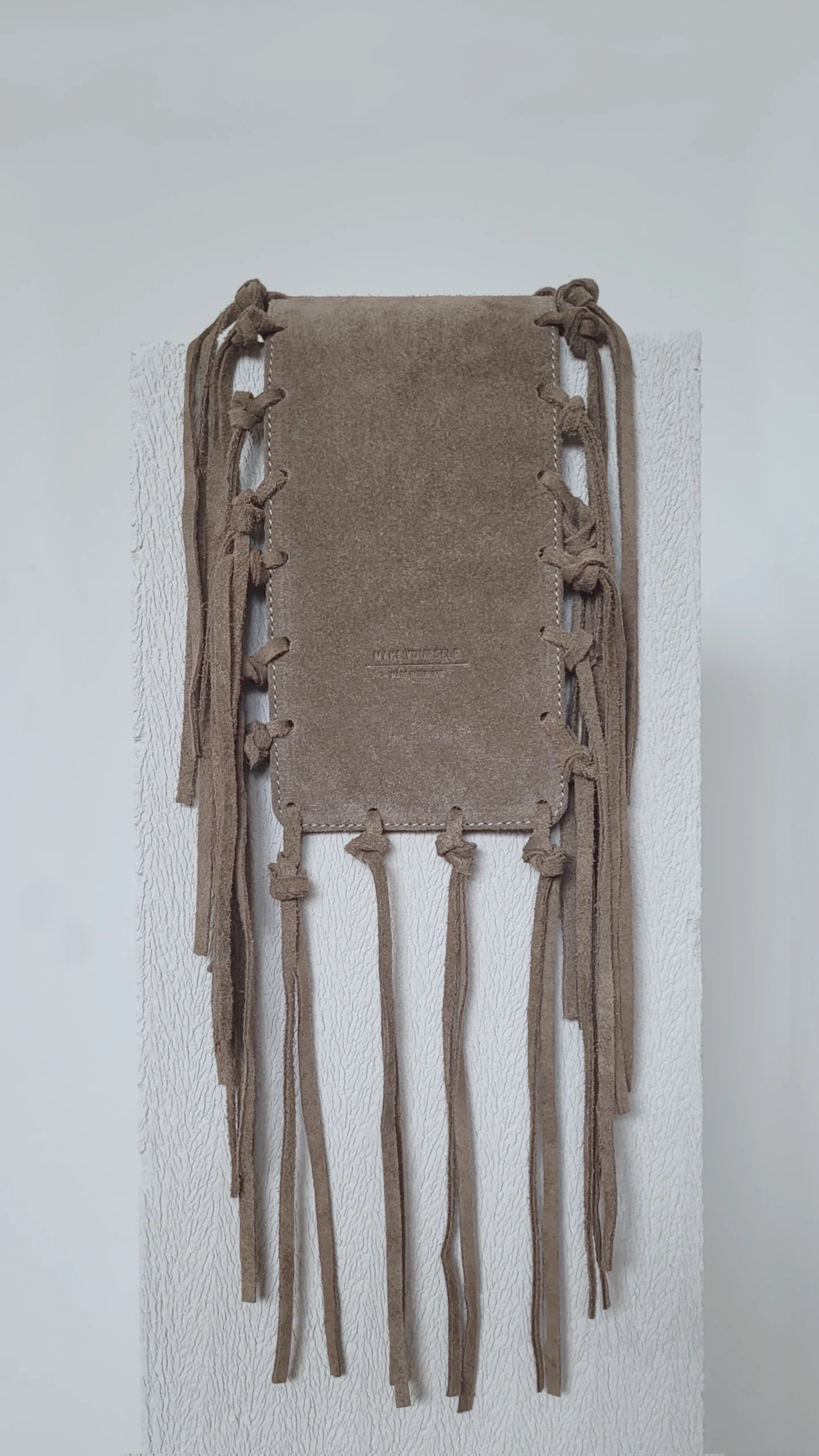 Ręcznie wykonana beżowa zamszowa klapa z frędzlami do torebki. Włoska skóra bydlęca zamszowa.