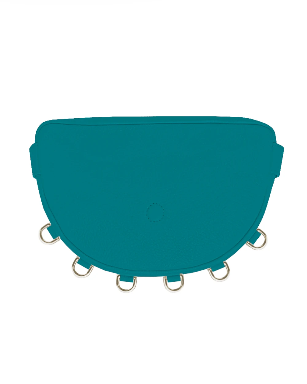 Serce zestawu stanowi duży turkusowy półksiężyc Luna M zapinany na jasnozłoty zamek z ręcznie plecioną zawieszką, wykończony odporną na zabrudzenia czarną poliestrową podszewką. W środku półokrągłej torebki jedna komora z niezapinaną kieszonką — możesz zwiększyć pojemność torebki poprzez kieszeń wewnętrzną Pocket Luna w kolorze torebki bazowej lub dowolnym z oferty.