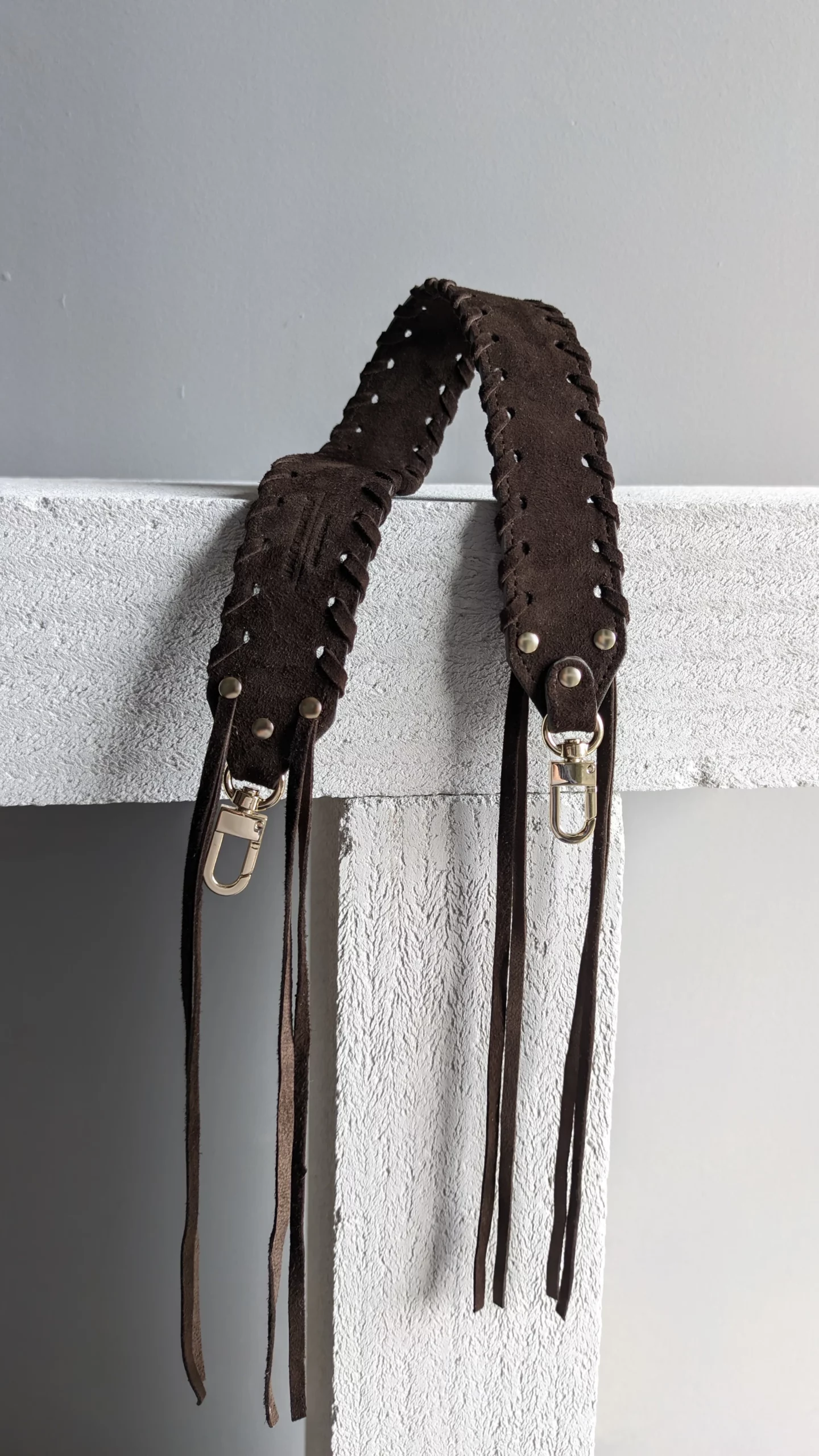 Ręcznie wykonany brązowy pasek do torebki z ozdobnym pleceniem. Skóra bydlęca zamszowa.
