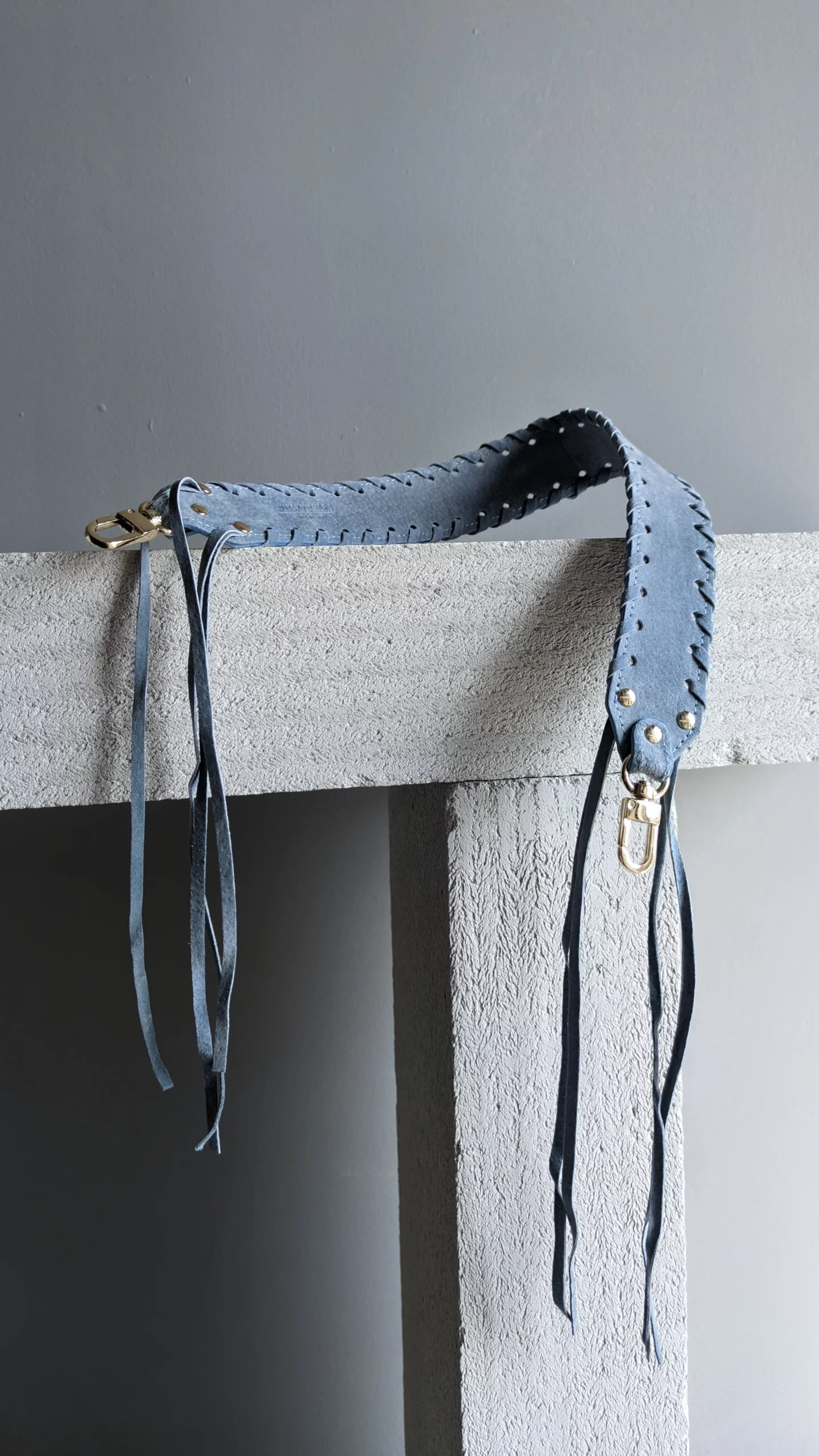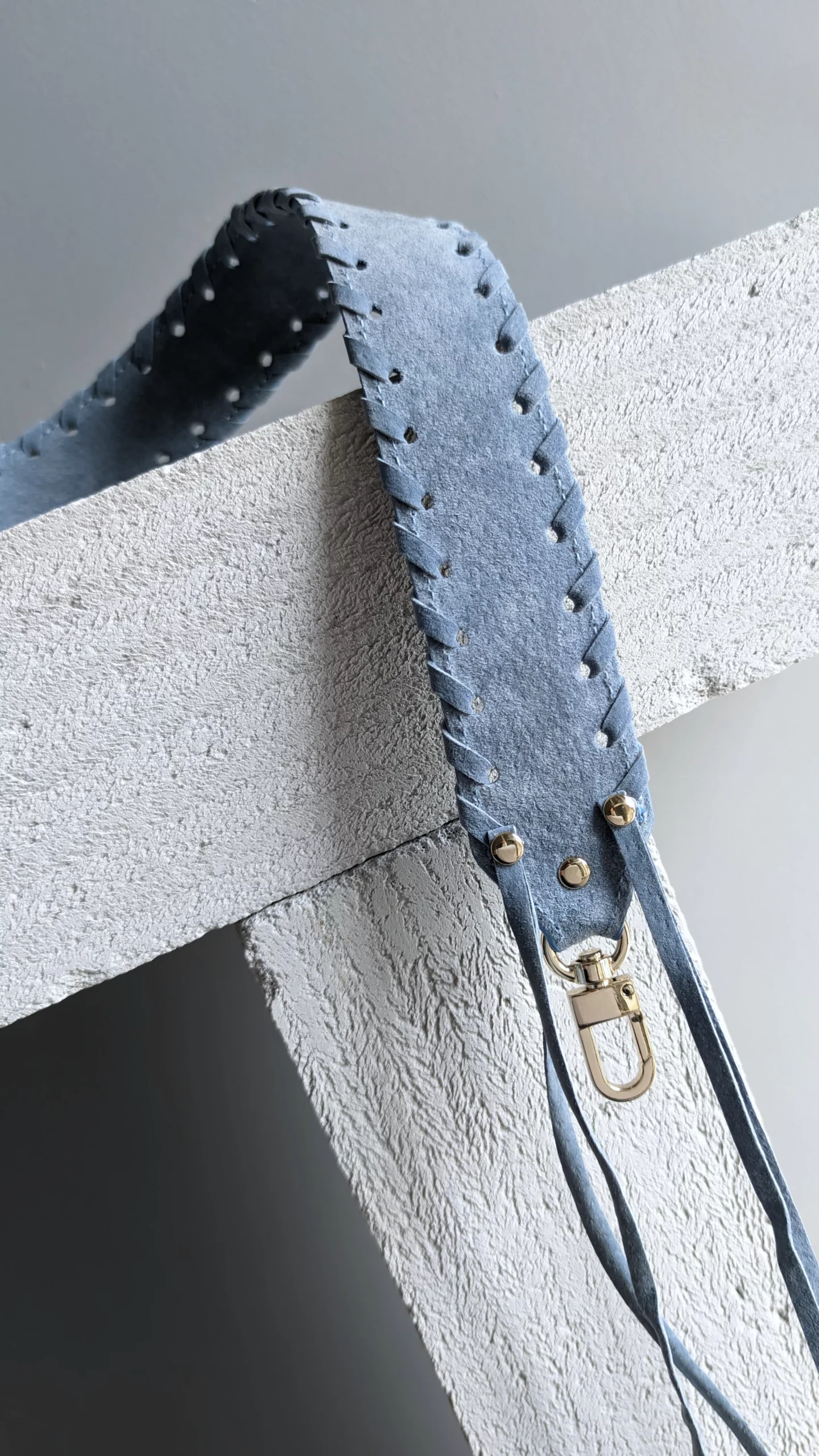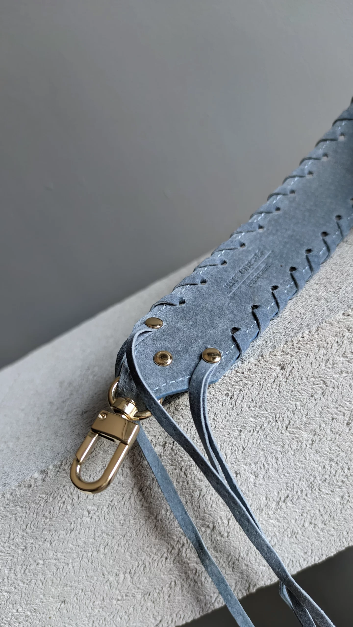 Ręcznie wykonany błękitny pasek do torebki z ozdobnym pleceniem. Skóra bydlęca zamszowa.