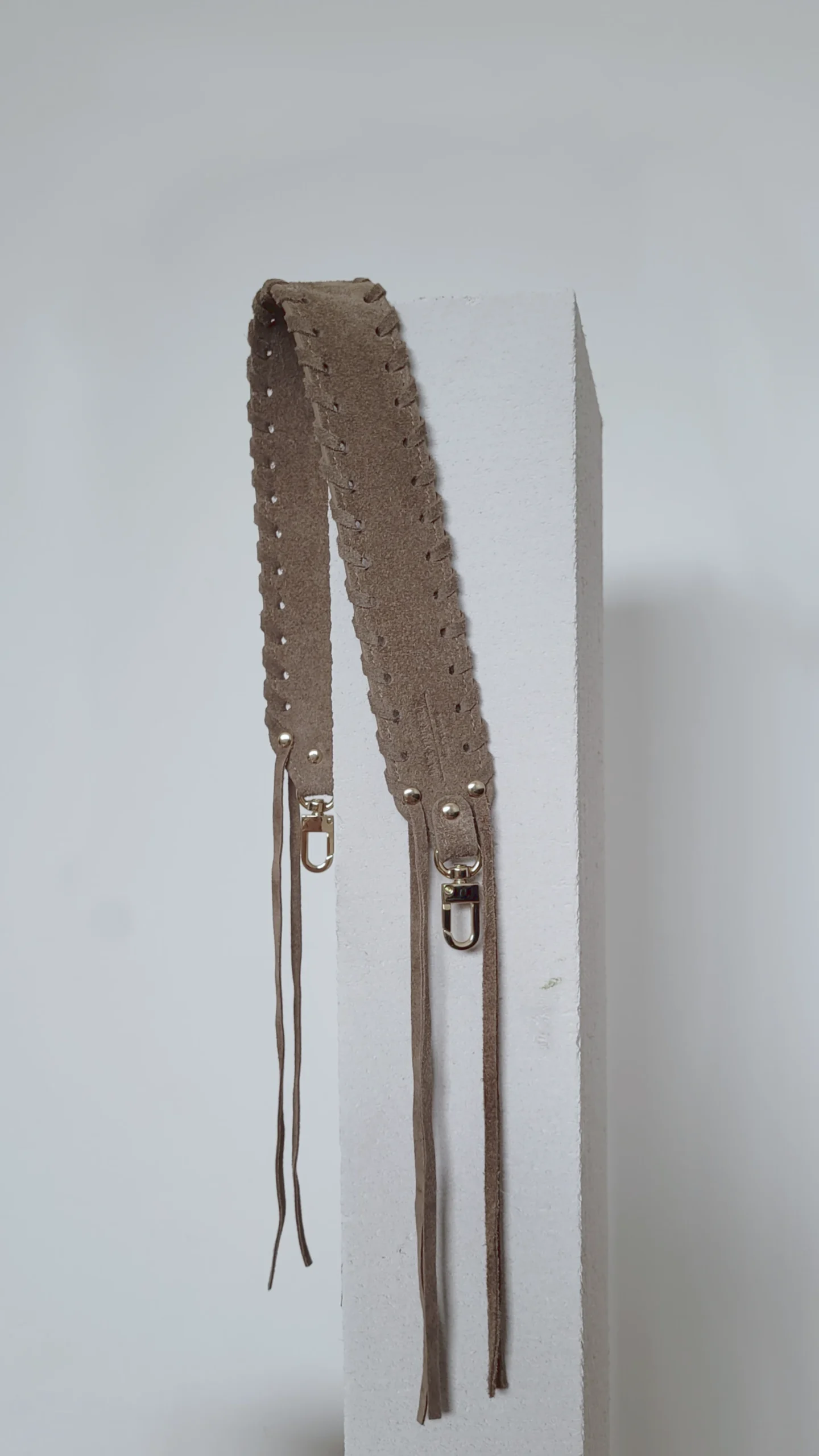 Zamszowy krótki pasek do torebki FRINGES tymczasowo wydłużysz na przykład poprzez dopięcie złotych łańcuszków Duo Chain. Ozdobne krótkie paski wraz z klasycznymi długimi paskami Make Yourself – zarówno w duecie, jak i w formie przedłużenia – nie tylko zwiększają walory użytkowe, ale i podkreślają unikalny charakter Twojej torebki modułowej.