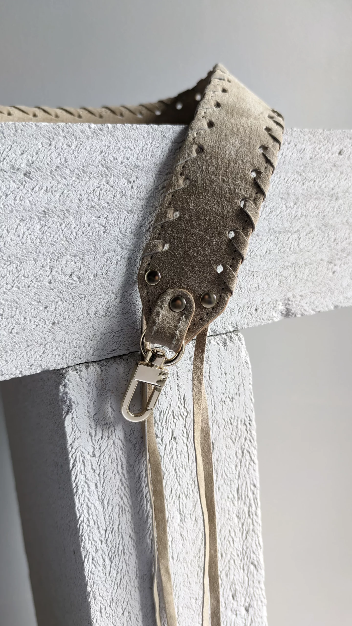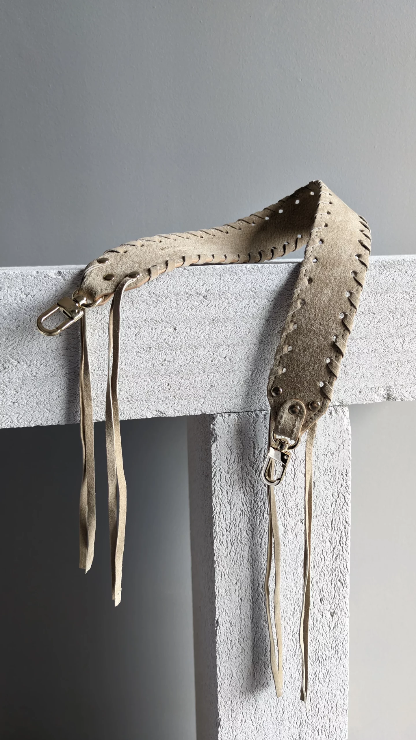 Ręcznie wykonany beżowy pasek do torebki z ozdobnym pleceniem. Skóra bydlęca zamszowa.