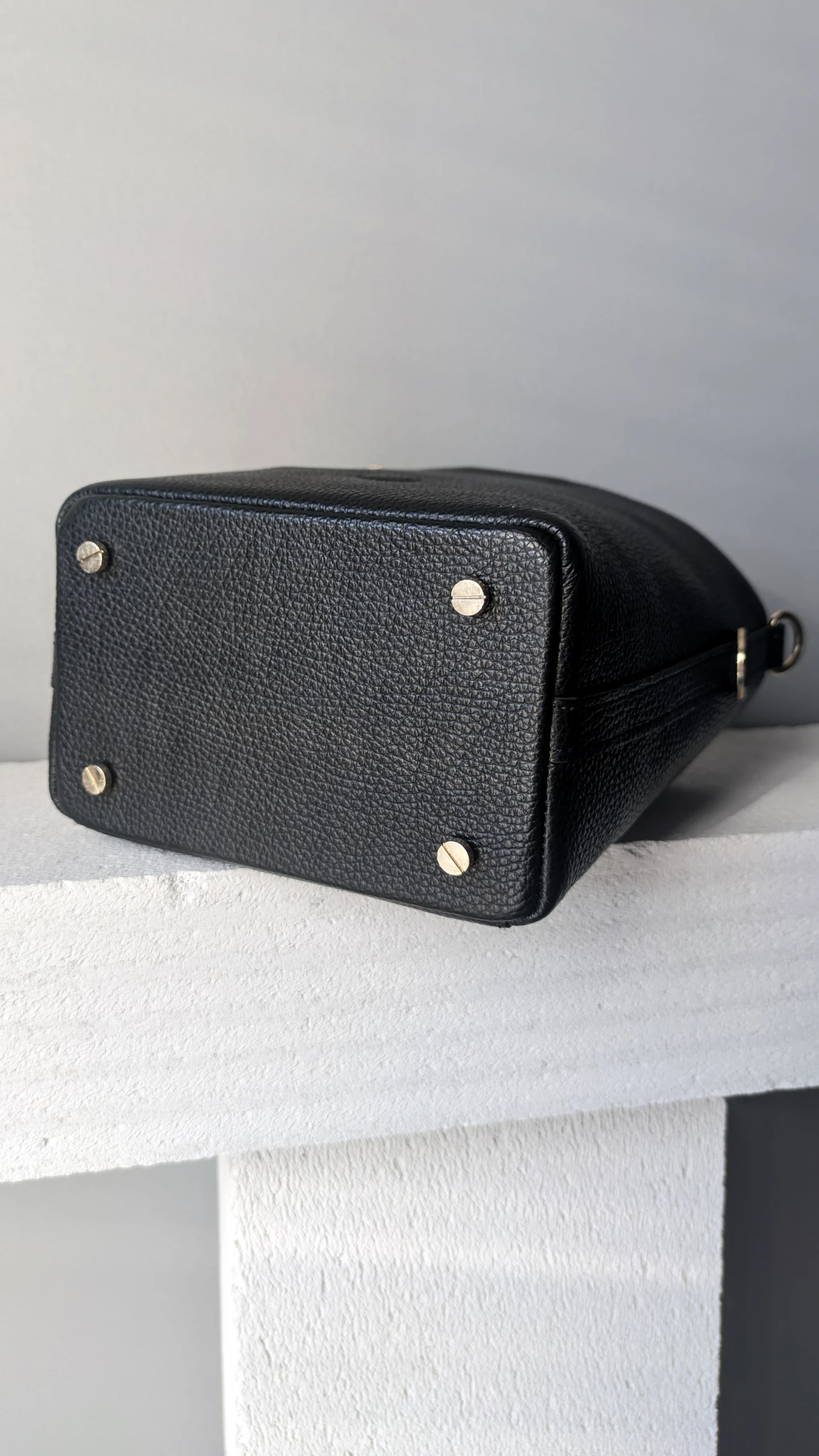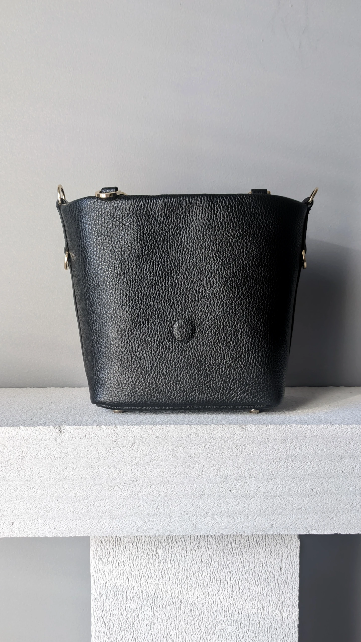 Personalizowana torebka modułowa JUPITER M Grain na podstawie której powstaje personalizowany set marki Make Yourself. Pojemna torebka typu bucket zapinana na dwa magnesy wszyte w wąską patkę (główna komora nie posiada dodatkowego zapięcia na zamek). Baza w środku wykończona odporną na zabrudzenia czarną poliestrową podszewką. Jedna komora z kieszonką na telefon zapinaną na jasnozłoty zamek z ręcznie plecioną zawieszką. Do torebki została wszyta skórzana smycz na klucze. Z zewnątrz niezapinana kieszonka na drobiazgi. Do bazy JUPITER możesz dopiąć dowolny długi, krótki pasek lub łańcuszek oraz uszy. Na spodzie torebki złote nóżki.