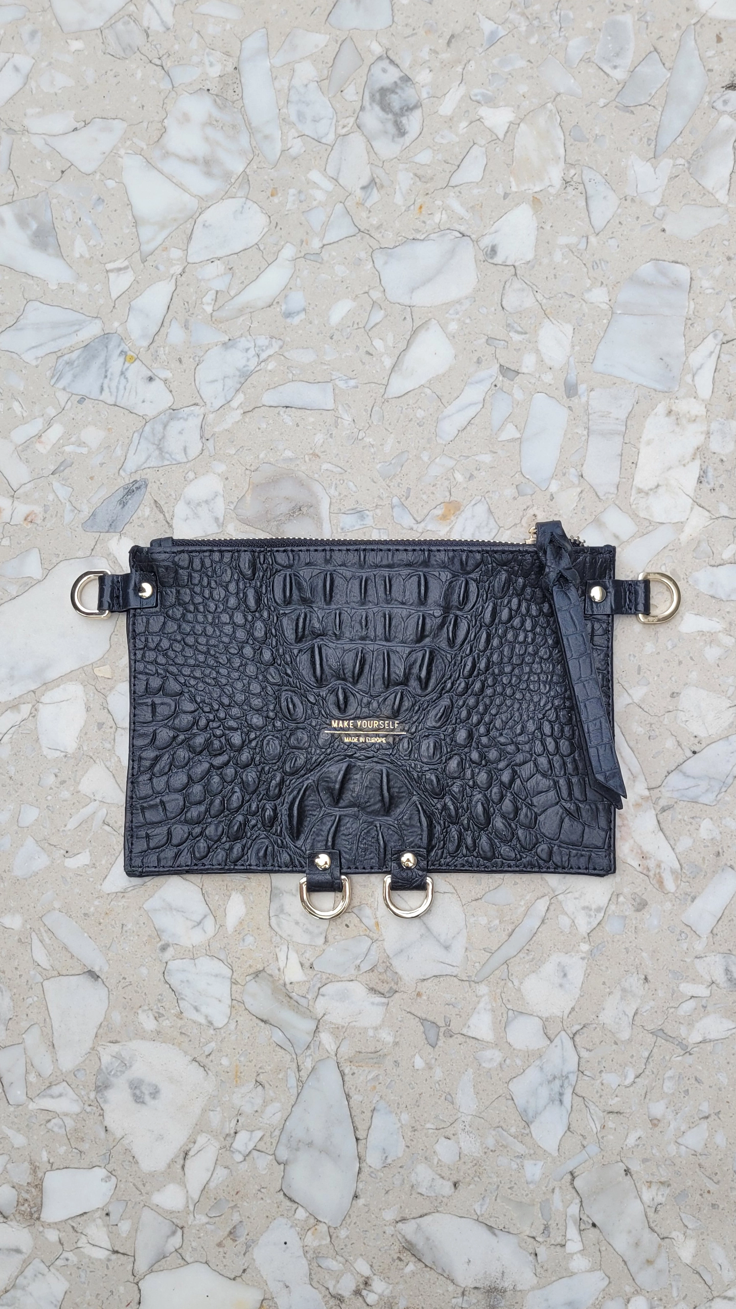 Skórzana czarna torebka saszetka Baby Clutch Black Cro marki Make Yourself. Mała płaska torebka, kosmetyczka, którą możesz dowolnie rozbudowywać o wymienne elementy, a także nosić samodzielnie jako kopertówkę lub nerkę nasuniętą na pasek do spodni.
