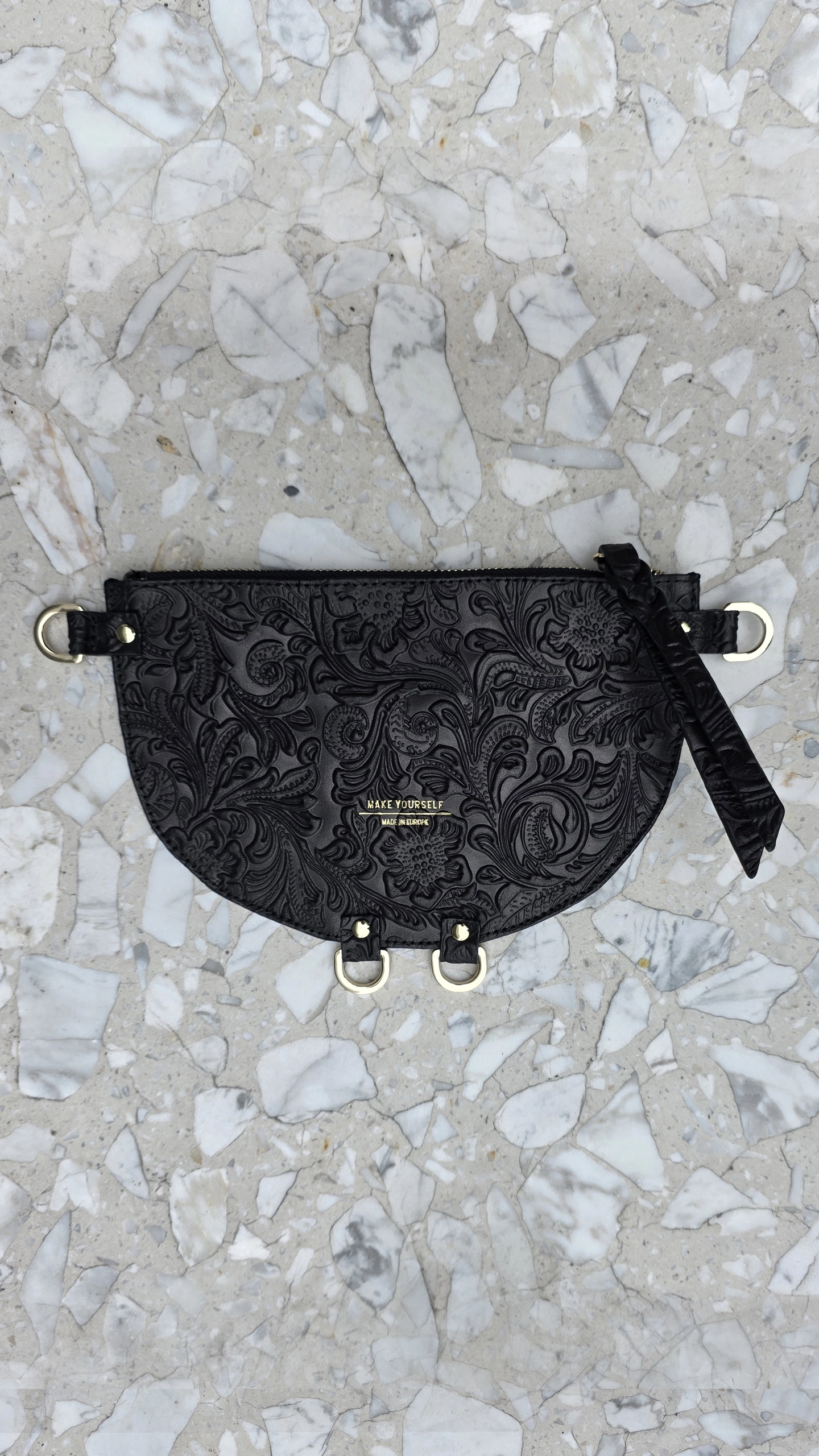 Skórzana czarna torebka saszetka Moon Clutch Pocket Black Wild Roses marki Make Yourself. Mała płaska torebka, kosmetyczka, którą możesz dowolnie rozbudowywać o wymienne elementy, a także nosić samodzielnie jako kopertówkę lub nerkę nasuniętą na pasek do spodni.