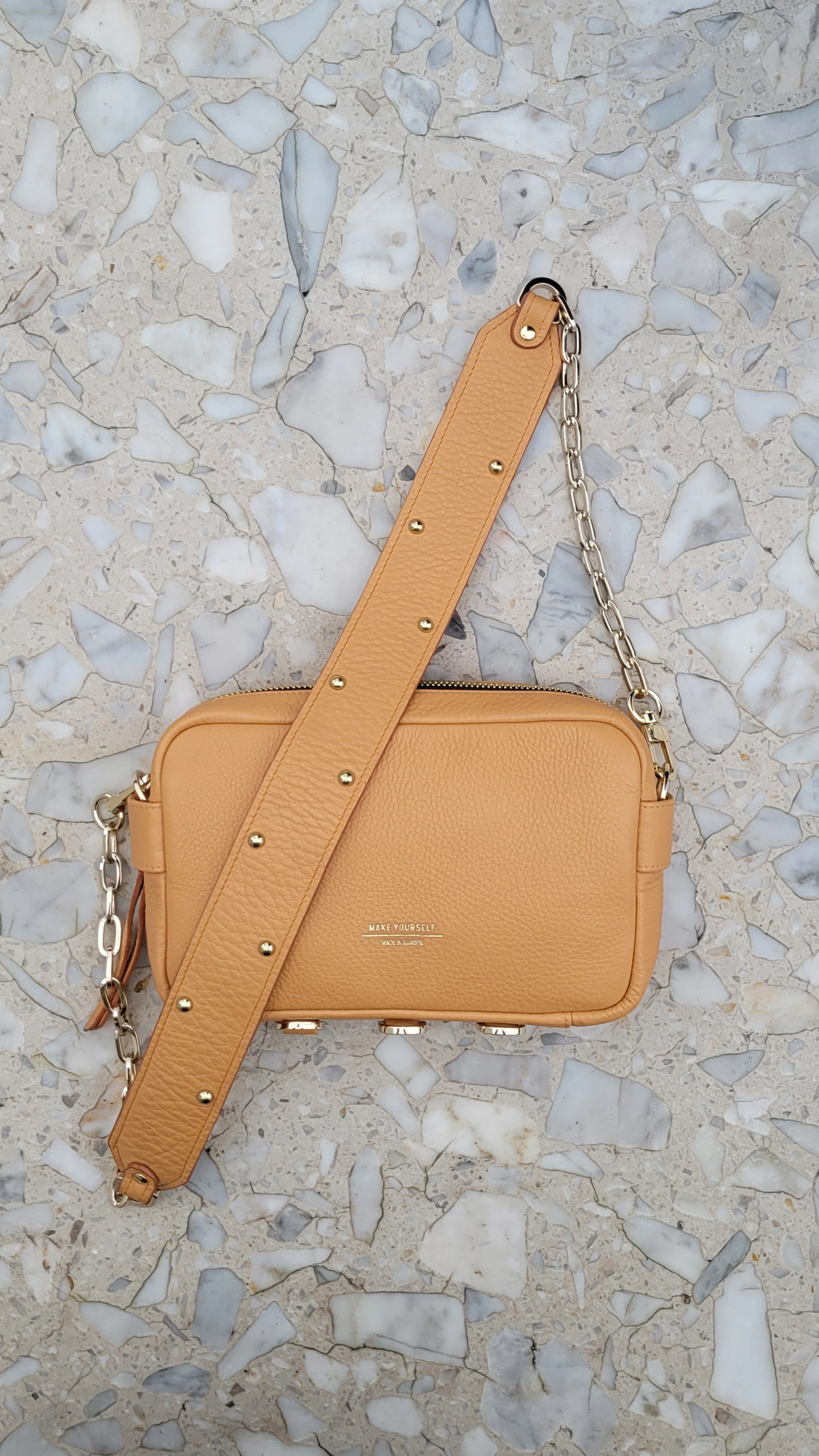 Skórzana listonoszka Long Cube Drops Apricot z wymiennymi akcesoriami to torebka polskiej marki Make Yourself. Model w obniżonej cenie z tytułu zakończenia produkcji akcesoriów ze skóry Apricot. Sama baza w dalszym ciągu podlega bezpłatnej personalizacji w postaci tekstu tłoczonego na ręcznie plecionej, skórzanej zawieszce zamka.