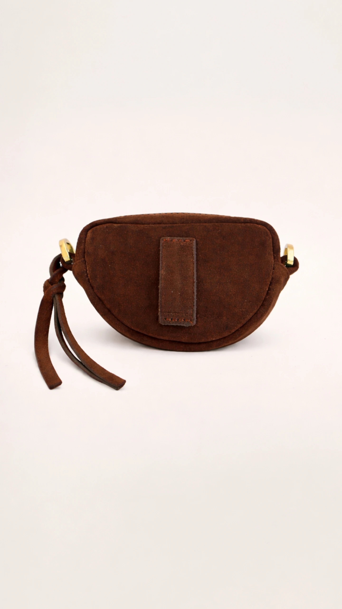 Skórzana torebka modułowa LUNA XS Choco na podstawie, której powstaje miniaturowa torebka marki Make Yourself. Mały półksiężyc zapinany na jasnozłoty zamek z ręcznie plecioną zawieszką, wykończony odporną na zabrudzenia czarną poliestrową podszewką. W środku torebki jedna komora.