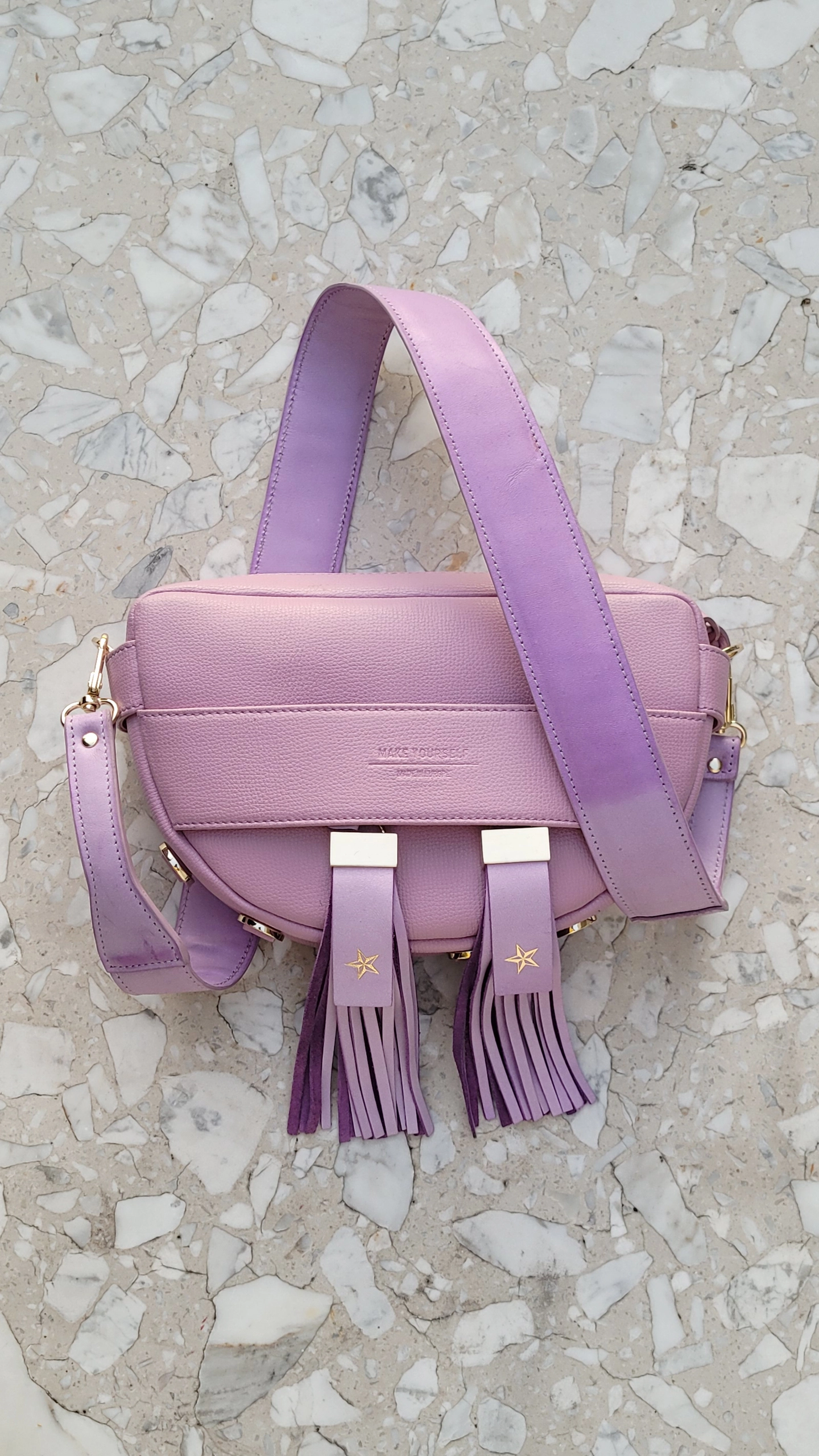Skórzana torebka półksiężyc Luna Lilac Ombre Quartz z wymiennymi akcesoriami to torebka polskiej marki Make Yourself. Model w obniżonej cenie z tytułu zakończenia produkcji akcesoriów ze skóry Lilac Ombre oraz Lilac Quartz. Sama baza w dalszym ciągu podlega bezpłatnej personalizacji w postaci tekstu tłoczonego na ręcznie plecionej, skórzanej zawieszce zamka.