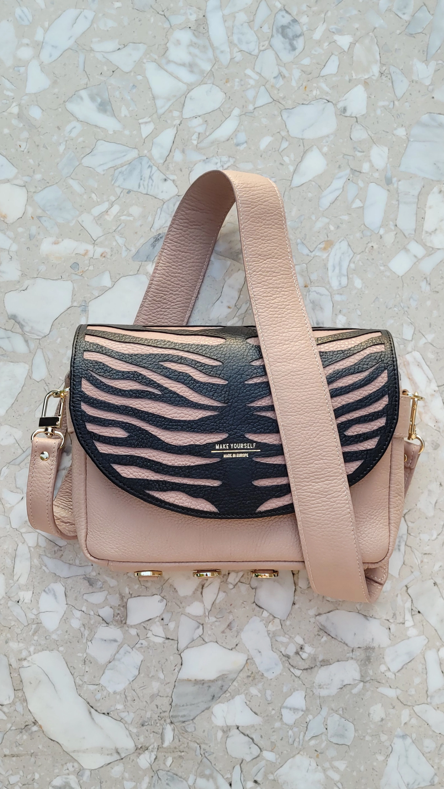 Skórzana torebka pudełkowa CUBE Pink Quartz Zebra z wymiennymi akcesoriami to torebka polskiej marki Make Yourself. Model w obniżonej cenie wyłącznie z tytułu zakończenia produkcji akcesoriów ze Pink Quartz oraz KLAPY Zebra. Sama baza w dalszym ciągu podlega bezpłatnej personalizacji w postaci tekstu tłoczonego na ręcznie plecionej, skórzanej zawieszce zamka.
