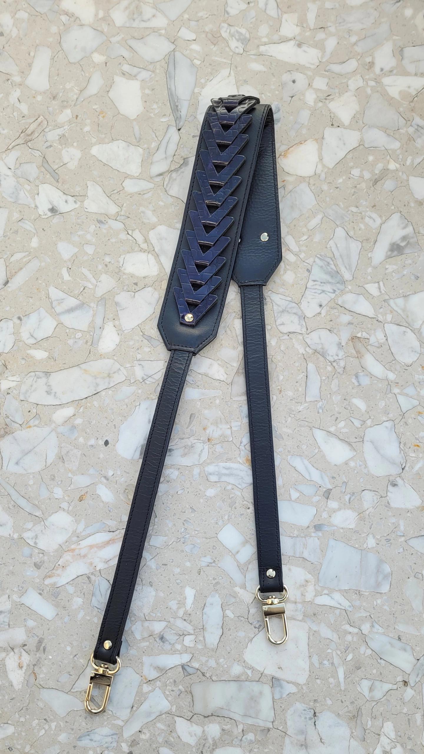 Czarny pasek do torebki wykonany z włoskiej skóry naturalnej. Skóra bydlęca gładka z trójkątami o fakturze krokodyla.