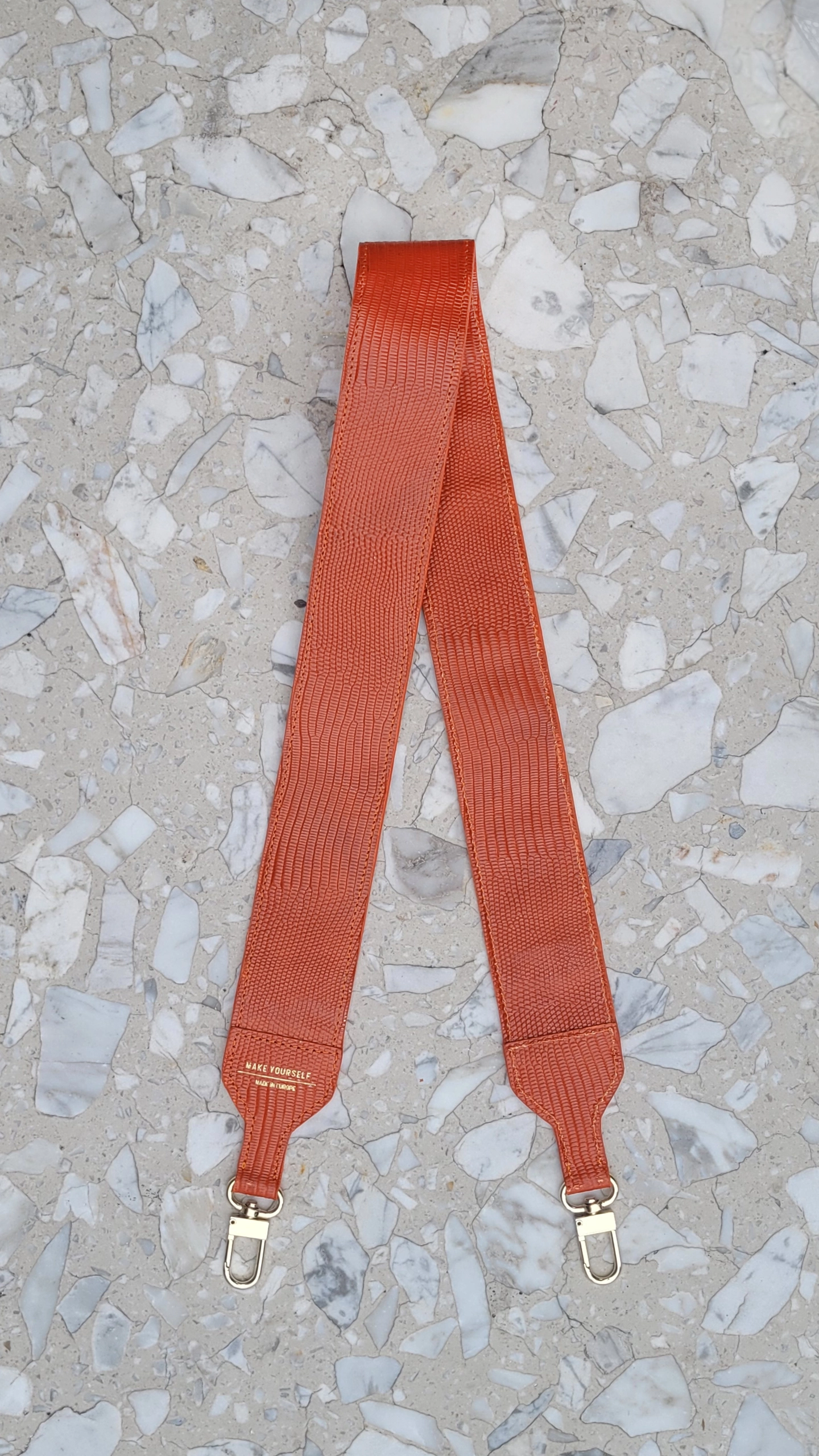 Skórzany długi pasek do torebki Orange Lizard marki Make Yourself. Wymienny pasek do dowolnej bazy dopniesz za pomocą metalowych, jasnozłotych karabińczyków. Standardowa długość paska nadaje się do wygodnego noszenia damskiej torebki na ramieniu, możesz również przełożyć pasek przez ramię. Decydując się na odpowiednią długość, należy oczywiście wziąć pod uwagę osobiste preferencje oraz budowę sylwetki.