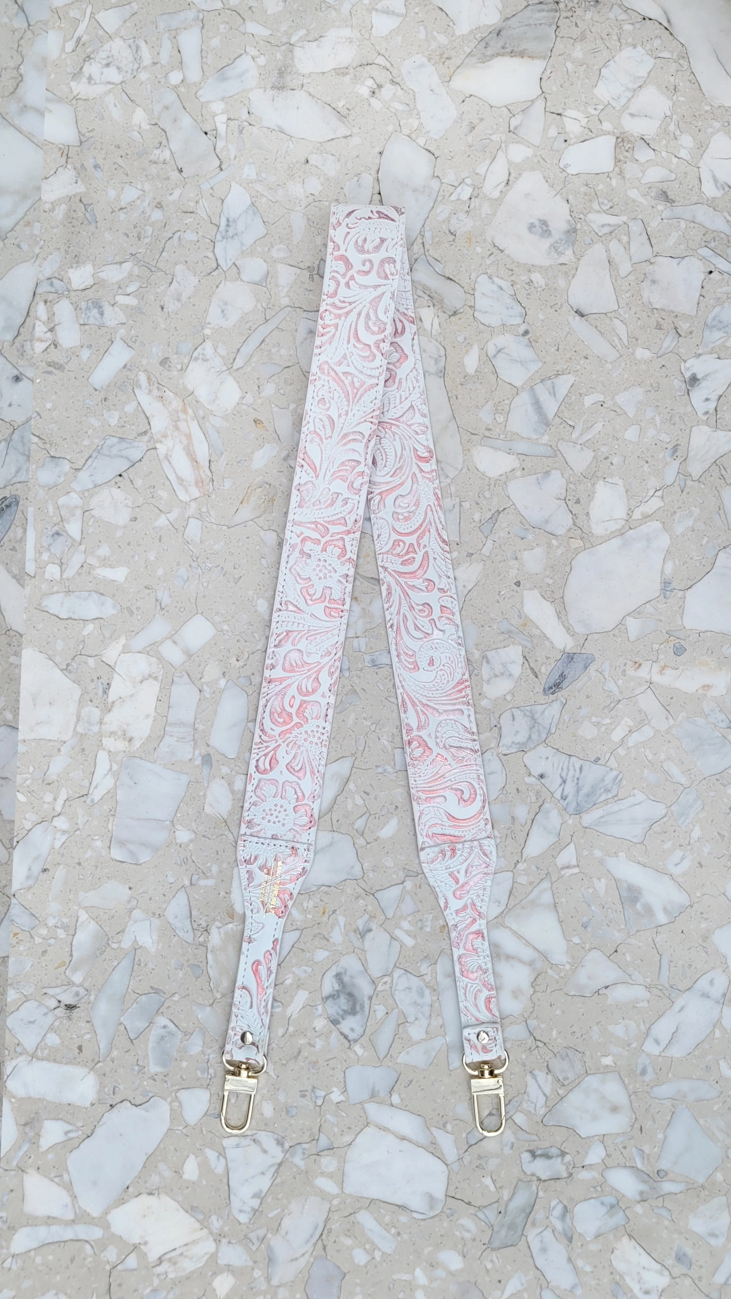 Biały pasek do torebki wykonany z włoskiej skóry naturalnej. Skóra bydlęca o fakturze kwiatów.