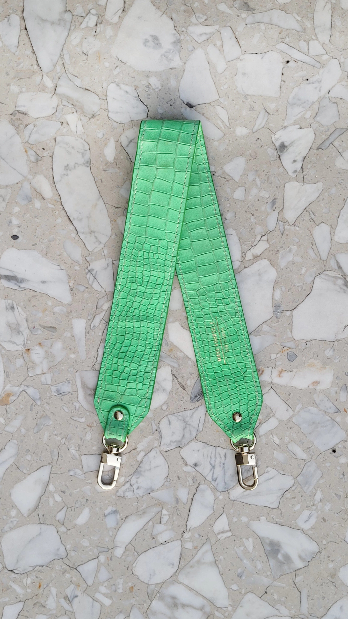 Ręcznie wykonany zielony odpinany pasek do torebki. Skóra bydlęca o fakturze krokodyla.