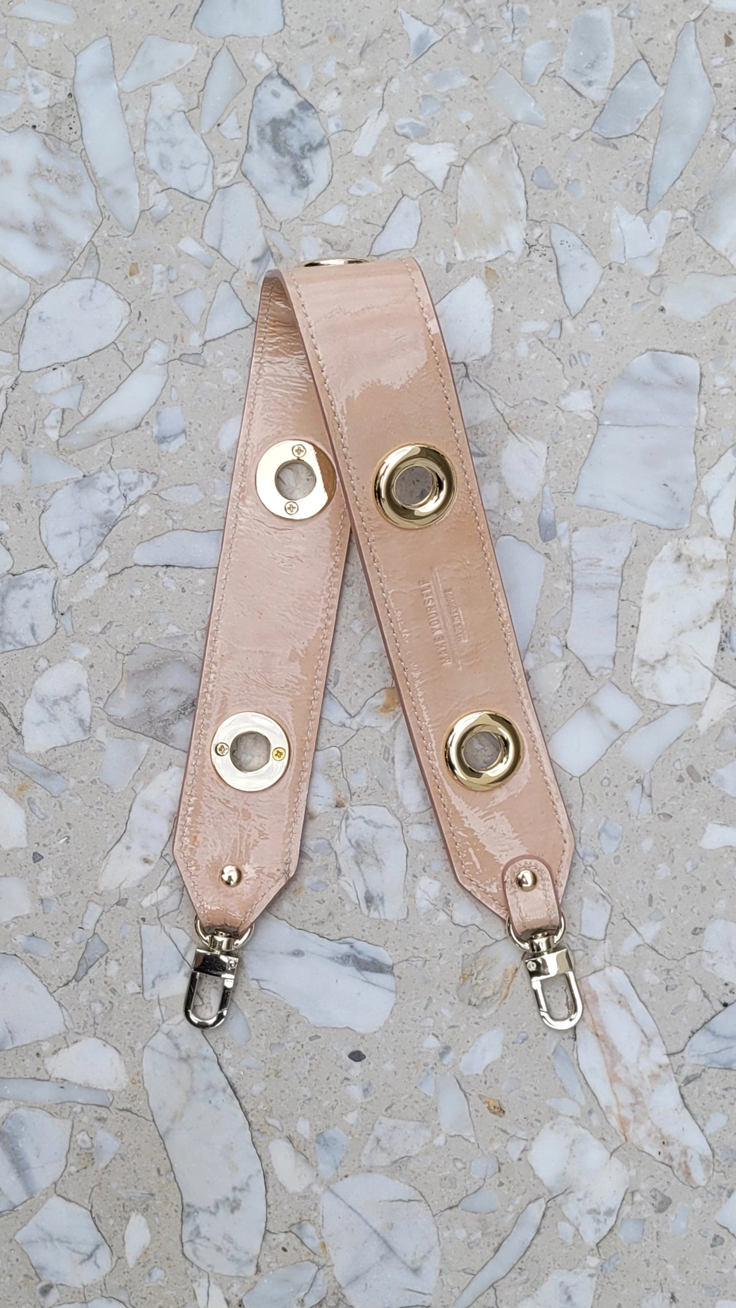 Ręcznie wykonany różowy odpinany pasek do torebki. Skóra bydlęca lakierowana.