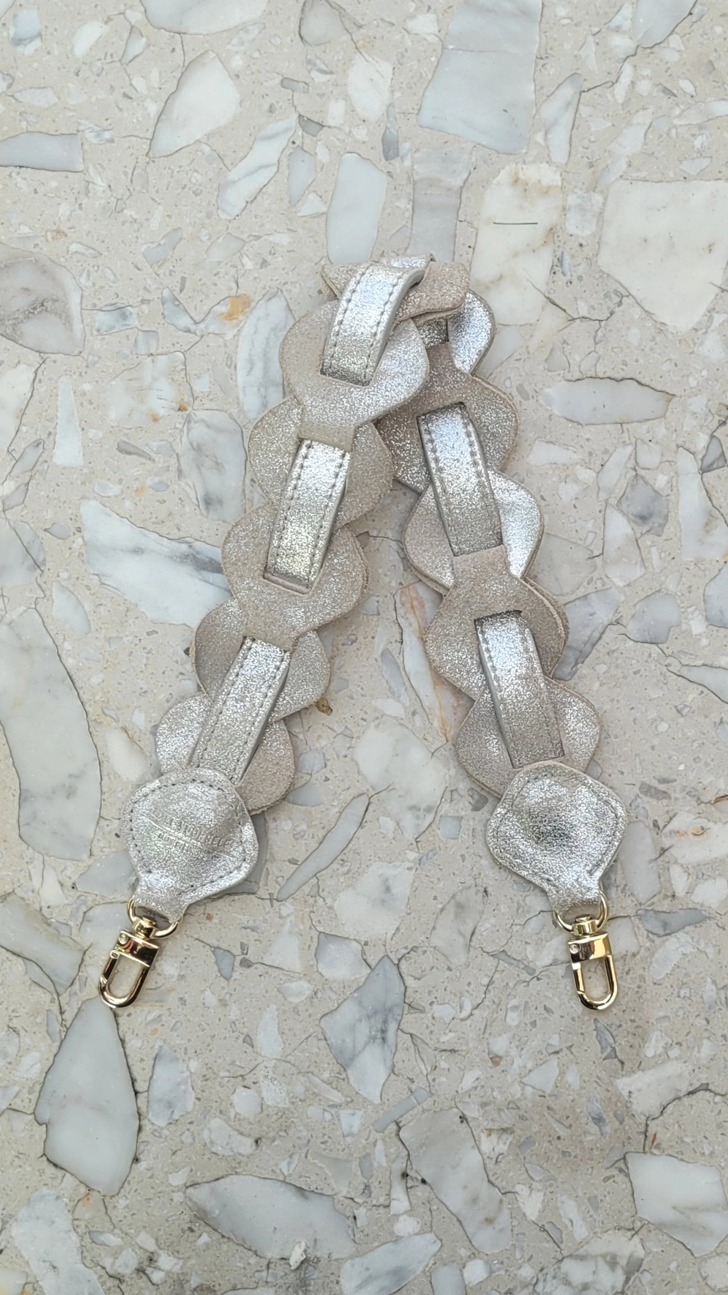 Ręcznie wykonany srebrny odpinany pasek do torebki. Skóra bydlęca zamszowa.
